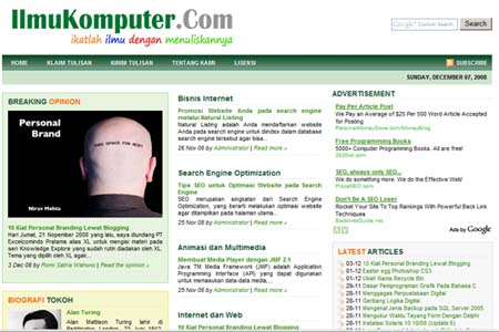 Screenshoot diatas adalah tampilan baru IlmuKomputer.Com, khususnya bagian Knowledge Sharing yang mendiami domain IlmuKomputer.Org. Saya coba mengubah desain dengan tampilan ala media massa elektronik. Beberapa kolom yang muncul, sebenarnya adalah kategori yang saya anggap menarik untuk ditampilkan di top page.